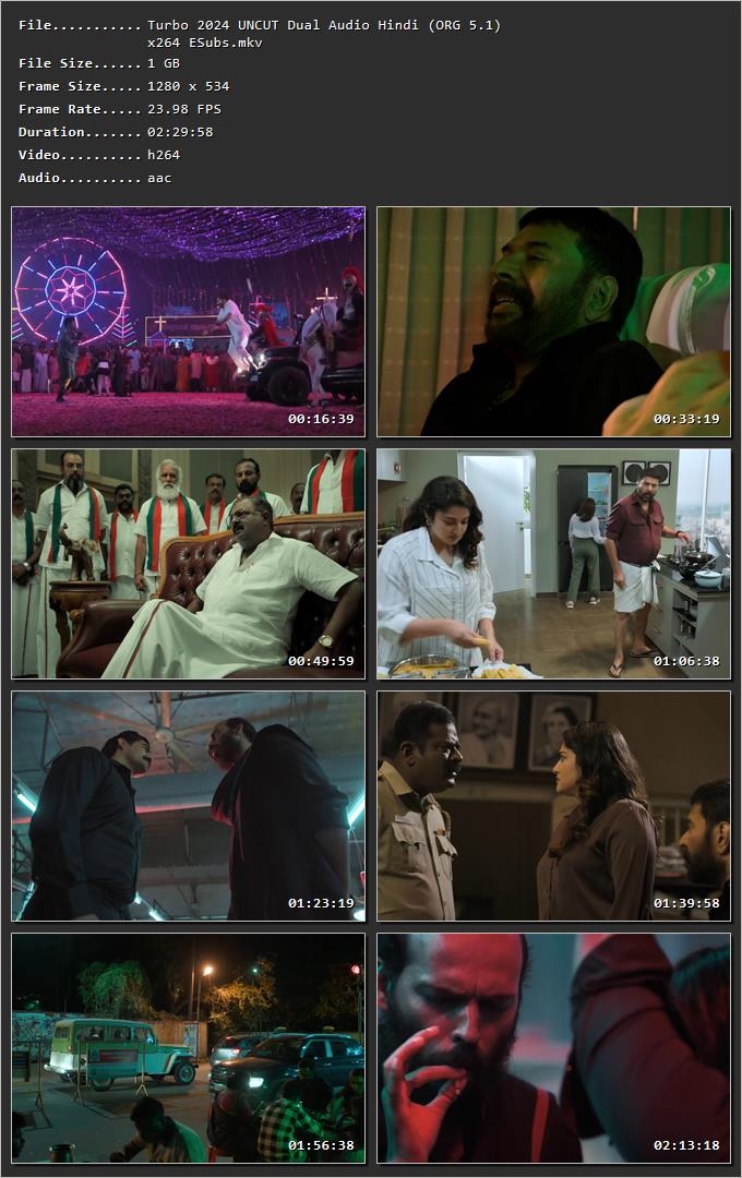 Actors: Mammootty as Turbo Jose, Raj B Shetty as Vetrivel Shanmugham Sundharam, Anjana Jayaprakash as Indulekha, Kabir Duhan Singh as Vincent, Niranjana Anoop as Sithara, Shabareesh Varma as Jerry, Sunil Varma as Auto Billa, Bindu Panicker as Rosakutty, Dileesh Pothan as Andrew, Johny Antony as Vakachan, Amina Nijam as Nirajhana, Namo Narayanan as Dilli Babu, Abin Bino as Sanoop, Prasanth Alexander as SI sijo, Abu Salim as Andrew's Assistant, Nishanth Sagar as Indulekha's brother, Vijay Sethupathi as (Voice), P N Sunny as , Ananth Nag as , Supergood Subramani as , Adarsh Sukumaran as , Kunchan as , Mani Shornur as , Vineeth Thattil David as , Sandhya Manoj as , Rahul Rajagopal as , Sruthy Suresh as Nurse, Manju Satheesh as Jerry's Mother