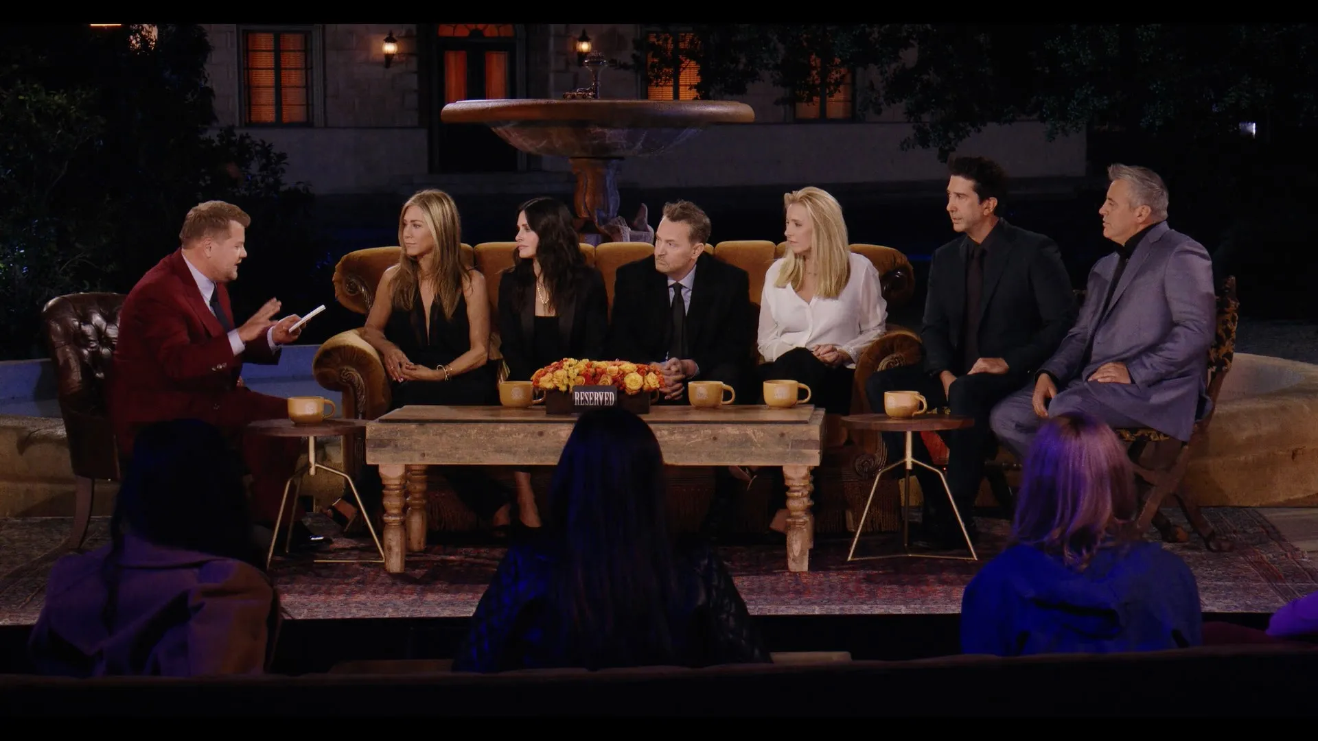 Actors: Jennifer Aniston as Self, Courteney Cox as Self, Lisa Kudrow as Self, David Schwimmer as Self, Matt LeBlanc as Self, Matthew Perry as Self, James Corden as Self - Moderator, Maggie Wheeler as Self, Tom Selleck as Self, Elliott Gould as Self, Christina Pickles as Self, James Michael Tyler as Self, Larry Hankin as Self, Thomas Lennon as Self, Reese Witherspoon as Self, David Beckham as Self, Lady Gaga as Self, Mindy Kaling as Self, Kit Harington as Self, Malala Yousafzai as Self, Justin Bieber as Self, Cara Delevingne as Self, Cindy Crawford as Self, Paul Rudd as (archive footage), Danny DeVito as (archive footage), Ben Stiller as (archive footage), Julia Roberts as (archive footage), Brad Pitt as (archive footage), Sean Penn as (archive footage), Kim Tae-hyung as Self, Kim Seok-jin as Self, Park Ji-min as Self, Min Yoon-gi as Self, Kim Nam-joon as Self, Jeon Jung-kook as Self, Jung Ho-seok as Self